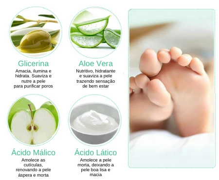 Esta máscara esfoliante é a única do mercado que penetra rapidamente apenas a camada de pele morta removendo todas as células secas e rachadas proporcionando pés limpos, iluminados e macios sem dor.